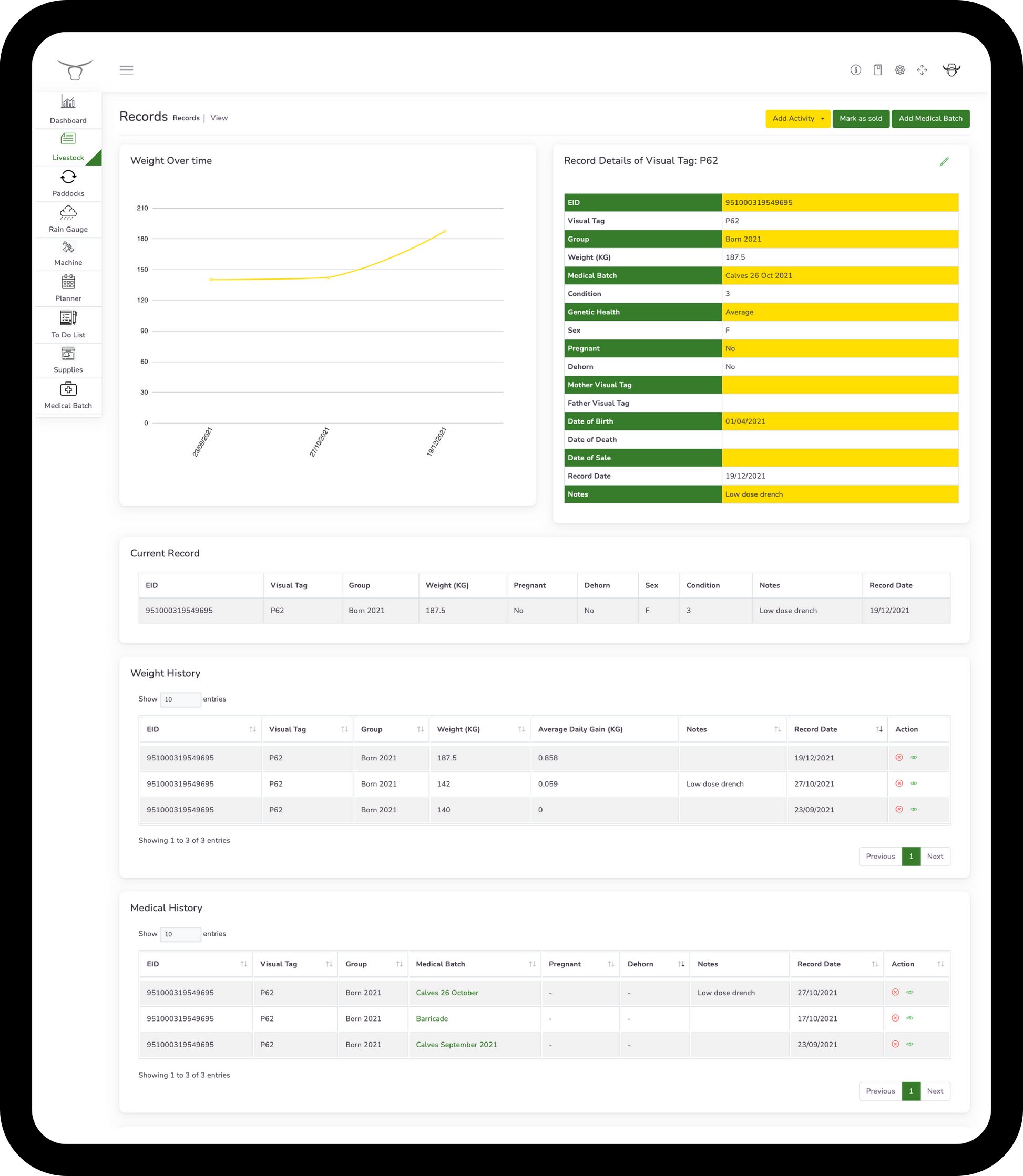 Combine with our Livestock Management Software to measure average daily weight gain (ADG) with individual medical records and notes.