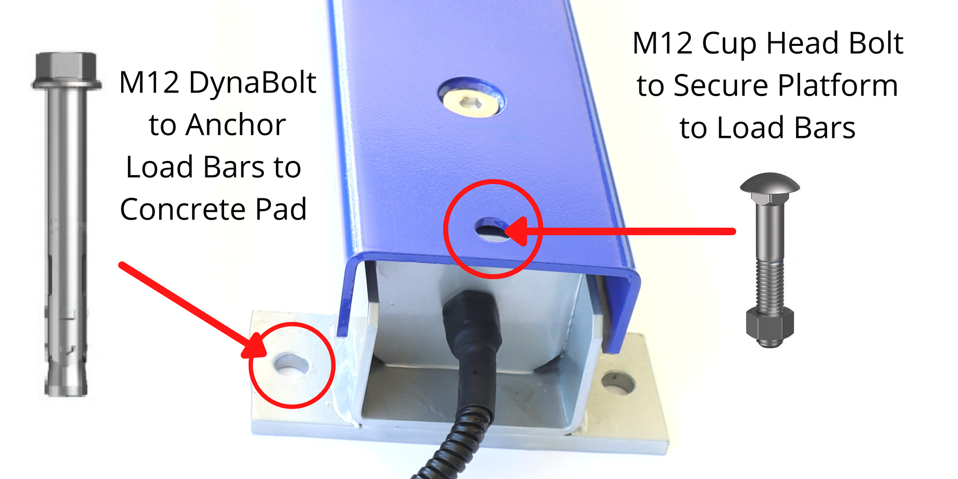 There are M12 sized holes on the edge of each bar so you can use an M12 cup bolt to secure your platform to the top of the load bars. There is clear and easy access to the bolt area to tighten as required before and after use of the system.